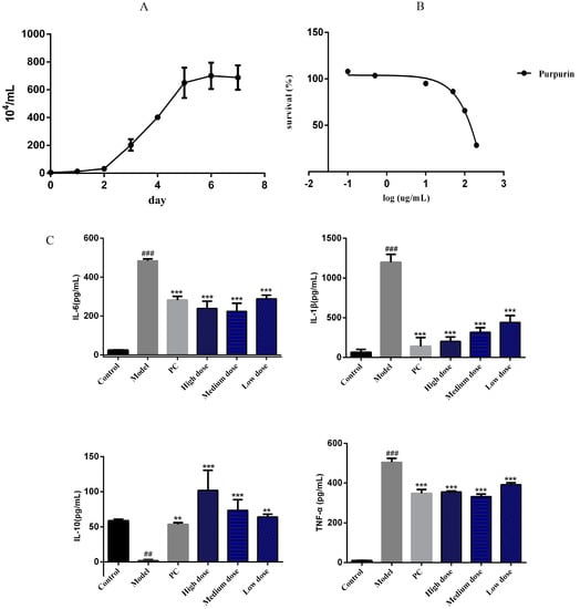 The effect of purpurin on inflammatory factors. (A) The growth curve of RAW 264.7 cells, n = 3. (B) Assessment of purpurin cytotoxicity using MTT assay. The tested concentrations of purpurin were 200, 100, 50, 10, 0.5, and 0.1 μg/mL, respectively, n = 3. (C) The anti-inflammatory effect of purpurin, the purpurin concentrations in the high-, medium-, and low-dose groups were 1, 0.5, and 0.1 μg/mL, respectively. Model: LPS group, PC: positive control group. Data are represented as mean ± SD. ### p < 0.001, ## p < 0.01 vs. control. *** p < 0.001, ** p < 0.01 vs. model.