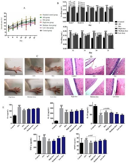 The AIA rats were randomly divided into five groups (n = 8 per group) including te AIA group, AIA + Dex group (1.25 mg/kg), AIA + purpurin high-dose group (80 mg/kg), AIA + purpurin medium-dose group (60 mg/kg), and AIA + purpurin low-dose group (40 mg/kg), the normal rats were separated to two groups (n = 8 per group), control group and standard control group (80 mg/kg purpurin); the standard control group was established to observe the toxicity of purpurin for normal rats. Purpurin powder was dissolved to 4 mg/mL, 6 mg/mL and 8 mg/mL with 0.5% CMC-Na solution. After CFA injection for 14 days, rats were given corresponding drugs by gavage for 21 days. The weight and paw swelling of rats were recorded every 3 days. Paw swelling was measured by the volumetric method. The weight gain rate was calculated with the following formula: Growth rate (%) = (Mt − M0)/M0, where M0 and Mt are weight on the day of RCE administration (day 0) and on day t after administration, respectively.