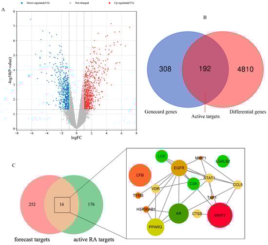 Analysis of RA genes and forecast targets of purpurin against RA, and functional characterization of potential targets of purpurin against RA. (A) Volcano-plot representation of differential gene expression. (B) Venn diagram depicting coincident genes of differential genes (top 500) and related genes from the GeneCard database. (C) Venn diagram depicting coincident genes of purpurin forecast targets and active RA genes.