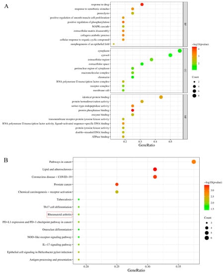 The functional characterization of potential targets of purpurin against RA. (A) Gene ontology analysis of potential targets of purpurin, biological process (BP), cell component (CC), molecular function (MF). (B) Kyoto Encyclopedia of Genes and Genomes (KEGG) pathway of potential genes of purpurin.