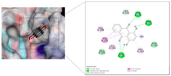 The molecular docking was conducted to uncover the under mechanism of purpurin on key target MMP3. The results showed that purpurin was in the pocket and interacted with amino acid residues of MMP3, purpurin formed hydrogen bond with the amino acid residue Ala165, Tyr223 and Pro221, formed carbon hydrogen bond with Leu222, formed two π-π bond with His201, and generated van der Waals interaction with Glu202 and Asn162, formed π-alkyl bond with Leu164, Val163 and Val198, and the binding energy between purpurin and MMP3 was −6.52 kcal/mol (Figure 8).
