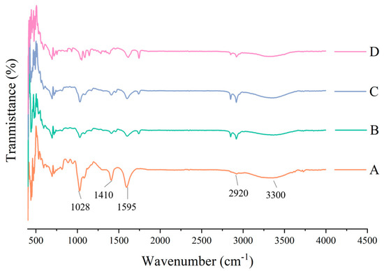 Effect of each component on the chemical bond of composite film (A: pure SA membrane; B: SA/CW composite membrane; C: SA/CW/G composite membrane; D: SA/CW/G/Vc-Ca composite membrane).