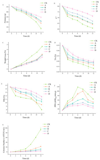 (A) Effect of coating treatment on firmness of fresh-cut apple; (B) Effect of coating treatment on chroma of fresh-cut apple; (C) Effect of coating treatment on weight loss rate of fresh-cut apple; (D) Effect of coating treatment on titratable acid of fresh-cut apple; (E) Effect of coating treatment on soluble solids of fresh-cut apple; (F) Effect of coating treatment on polyphenol oxidase activity of fresh-cut apple; (G) Effect of coating treatment on total colonies of fresh-cut apple (A: pure SA membrane; B: SA/CW composite membrane; C: SA/CW/G composite membrane; D: SA/CW/G/Vc-Ca composite membrane). (Original data shown in Table S1).