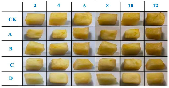 The shape and color changes of fresh-cut apples during 12 storage days (A: pure SA membrane; B:SA/CW composite membrane; C: SA/CW/G composite membrane; D: SA/CW/G/Vc-Ca composite membrane).