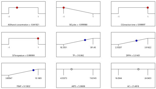 As it was already mentioned, AOA in garlic crude extracts is influenced by the presence of polyphenols (Table 1). Thus, it is rather expected that AOA is somewhat following the trend of TP. In particular, like for TP, linear term of extraction time and temperature had a positive effect on DPPH· scavenging activity and ferric reducing power (Table 2; Figures S2 and S3), suggesting that higher temperatures and longer extraction time causes recovery of compounds with significant AOA. Similar conclusion was reported by Mrkonjić et al. [26] for wild thyme extracts. However, contrary to TP, linear term of ETC exhibited a positive impact on FRAP assay values, and interaction of ethanol and time positively influenced the DPPH assay values (Table 2). Such outcome again indicates that phenols are not the only drivers of AOA in crude garlic extracts, and that AC also has certain impact on AOA (Table 1). Thus, it is of paramount importance to optimize extraction maximization of all targeted responses that were successfully fitted to a second-order polynomial model.