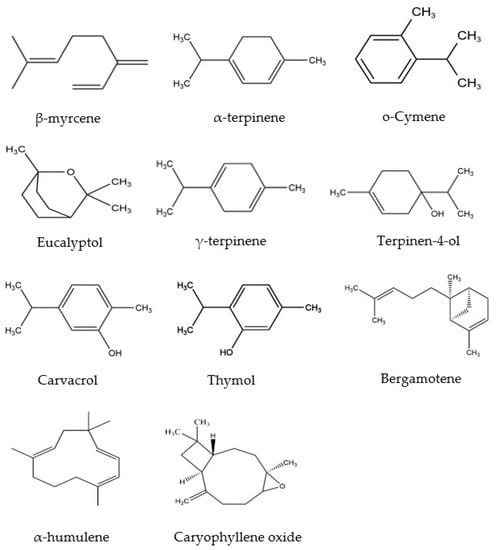 EO was isolated from M. Chinensis ‘Jiangxiangru’ herb by hydrodistillation using a Clevenger apparatus, and the EO isolation yield was 1.20%. As our previous study had described, the components of the EO were analyzed by gas chromatography, and mass spectrometry (GC-MS) and results showed that the main components were carvacrol (75.4%), thymol (11%), o-cymene (5.14%), and γ-terpinene (1.31%) [7].