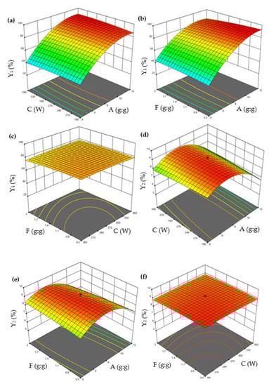 The ANOVA results of the quadratic model Equations (1) and (2) are presented in Table 2. According to the ANOVA results, the regression analysis of the experimental designs indicated that the linear coefficients (A), interaction coefficient (AF), and quadratic coefficients (A2) were significant (p < 0.05) to Y1, and the linear coefficients (A) and quadratic coefficients (A2) were significant (p < 0.05) to Y2. The model fitness was assessed by regression coefficient values (R2) and adjusted R2 [35]. The value of R2 and adj. R2 was 0.9906 and 0.9785 in the Y1 model, respectively, and the value of R2 and adj. R2 was 0.9373 and 0.8567 in the Y2 model, respectively. These values suggested that both calculated models fitted accurately with the experimental data because of the smaller differences between adj. R2 and R2, which were less than 0.2 [35].