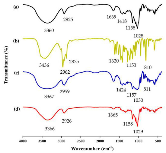 The spectrum of β-CD is presented in Figure 4a. The absorption peaks at 3360 cm−1 and 2925 cm−1 were assigned to O-H and C-H stretching vibrations, respectively [39]. The absorption peak at 1669 cm−1 was assigned to H-O-H stretching. The peaks at 1158 and 1028 cm−1 represented the vibrations of the C-O-C symmetrical and asymmetrical stretching, respectively [40,41]. Due to the presence of multiple components, the EO shows multiple absorption peaks. As shown in Figure 4b, the EO shows absorption bands in the range of 3200~3500 cm−1, which were related to the presence of -OH stretching. The two peaks at 2875 cm−1 and 2962 cm−1 were the C-H vibrational couplings of -CH2. The peaks at 1620, 1584, and 1513 cm−1 were assigned to the C=C stretching of the benzene ring of aromatic substances, such as carvacrol and thymol [42]. Compared with β-CD/EO IC, the absorption peaks of PM at 2959 cm−1 and 1030 cm−1 were redshifted, and the vibration intensity was weakened (Figure 4c). However, the peak intensity of β-CD/EO IC was slightly changed and was similar to β-CD in the range of 400 cm−1 to 1500 cm−1. Additionally, there were three peaks with weak stretching at 1516~1621 cm−1 owing to the bands for EO being obscured by strong and broad β-CD bands (Figure 4d) [43]. Furthermore, the peaks of β-CD/EO IC shifted at 3365 cm−1 and weakened at 1165 cm−1 [6,44]. Compared with β-CD/EO IC, the characteristic absorption peaks of EO almost totally disappeared at 500~1600 cm−1, and there were no new peaks observed. These changes indicated that the β-CD/EO IC had successfully formed via non-covalent bonds, such as hydrogen bonds [45,46].