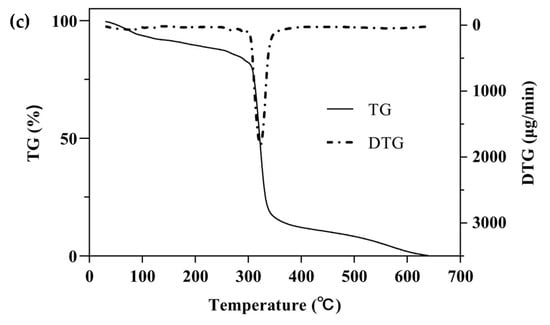 One of the simplest and most commonly used methods for studying the thermal behavior of any formulation or ICs is TG with a continuous increase in temperature [47]. The TGA/DTG curves of β-CD, PM, and β-CD/EO ICs are shown in Figure 5. There were two main mass loss peaks of β-CD, as shown in Figure 5a. The first weight loss was 10.86% from 30 to 100 °C, associated with the evaporation of water molecules in the β-CD cavity [48]. The second weight loss was 67.38% ranging from 270 to 350 °C, and the maximum degradation rate (2.58 mg/min) happened at 325 °C, which was related to the decomposition of β-CD molecules [39,40]. Figure 5b showed three lost peaks of the PM at 96, 135, and 323 °C, which were associated with water evaporation, EO decomposition, and β-CD degradation, respectively [16]. However, the peak of EO volatilization was not observed in the DTG curve of β-CD/EO IC (Figure 5c). At temperatures ranging from 100 to 300 °C, only one decomposition stage of β-CD/EO IC was characterized in the TGA curve with a slight mass loss of 4.42%. In addition, the maximum mass degradation rate was 1.81 mg/min at 322 °C. Furthermore, the DTG curve of β-CD/EO IC showed a peak (1.81 mg/min) at 322 °C lower than β-CD (2.58 mg/min) and PM (3.05 mg/min), indicating that the thermal stability of EO increased and there were no adverse interactions between EO and β-CD [49]. These results suggested that the β-CD/EO IC was effectively fabricated, and the thermal stability was improved, which was consistent with previous studies [50].
