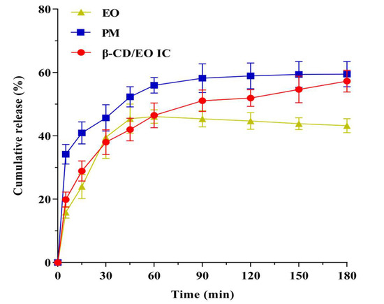 The results of dissolution profiles of EO, PM, and β-CD/EO IC are shown in Figure 6. According to the results, the release rate of EO increased gradually over time. The cumulative release amount of EO was 45.42% within 180 min, and the release reached equilibrium at 45 min. The release behavior of PM was similar to EO, and the maximum release was 55.98% within 60 min. On the contrary, the equilibrium time of β-CD/EO IC was 150 min, and the maximum cumulative release was 54.66%. These results indicated that β-CD/EO IC had slower release characteristics than EO and PM, which could prolong the EO’s curative effect. Therefore, it can be concluded that the bioactivity of the volatile components can be preserved by forming IC with β-CD.