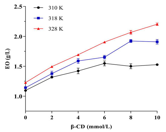 Phase solubility studies are the most common methods for determining the ability of macromolecules to interact with small molecules [52,53]. Figure 7 shows the results of the phase solubility study, in which the amount of EO increased with the increase of β-CD concentration and the temperature and reached a status of equilibrium. In this study, there were plateaus at 310 and 318 K at phase solubility curves, while the relationship was linear at 328 K, indicating that the temperature would affect the inclusion ratio of β-CD to EO. The possible reason for this phenomenon was that the M. Chinensis EO components were complex, and different components showed a competitive and synergistic relationship with CD, as in our previous study [54]. Generally, a relatively high temperature could enhance the hydrophobic interactions between the molecules [55]. A moderate high temperature was attributed to the increase the complexation of EO in β-CD.