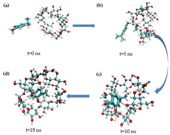 Representative images from carvacrol and β−CD simulation. (a) t = 0 ns; (b) t = 5 ns; (c) t = 10 ns; (d) t = 19 ns.