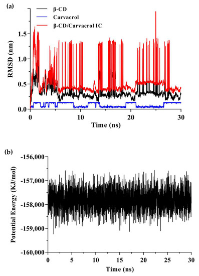 The results of molecular dynamics simulation. (a) The RMSD of the β−CD/carvacrol IC during 30 ns simulation; (b) The variation in potential energy of the β−CD/carvacrol IC during 30 ns simulation.