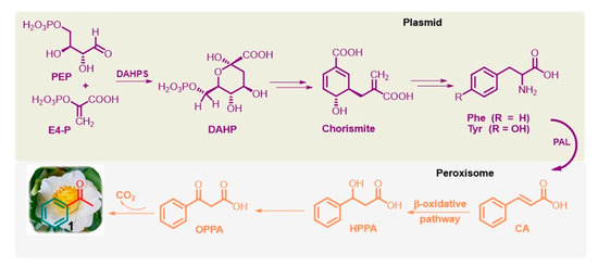 - Qualley, A.V.; Widhalm, J.R.; Adebesin, F.; Kish, C.M.; Dudareva, N. Completion of the core β-oxidative pathway of benzoic acid biosynthesis in plants. Proc. Natl. Acad. Sci. USA 2012, 109, 16383–16388. [Google Scholar] [CrossRef]