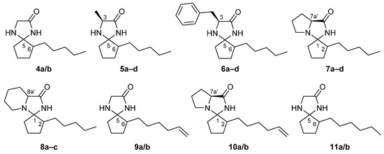 3.1.2. Synthesis of (3S)-3-methyl-6-pentyl-1,4-diazaspiro[4.4]nonan-2-one (5a–d)