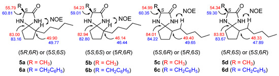 3.1.3. Synthesis of (3S)-3-benzyl-6-pentyl-1,4-diazaspiro[4.4]nonan-2-one (6a–d)