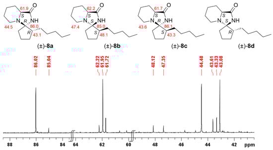 Reaction of racemic 2-piperidinecarboxamide with (±)-1 formed tricyclic profragrances (±)-8a–d bearing one six-membered and two five-membered rings (Figure 5). The reaction can yield four possible diastereoisomers, all of which are obtained as racemates. The reaction of (±)-1 with 2-piperidinecarboxamide seemed to be less efficient than with l-prolinamide, the crude reaction product was obtained in only 40% yield. As observed for the prolinamide derivatives described earlier, the different diastereoisomers of 8 were not formed in equimolar quantities, but in a ratio of 8a/8b/8c ≈ 71%:10%:19% (Figure 5). The presence of the fourth diastereoisomer, 8d, could not unambiguously be determined in the reaction mixture. A series of small signals in the 13C NMR spectrum of the crude compound, e.g., in the region between 48 and 42 ppm, might indicate its formation at less than 5%. Column chromatography afforded (±)-8a, a mixed fraction of (±)-8a and (±)-8b (ca. 44%:56%) and (±)-8c.