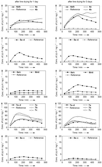 Figure 6 shows a comparison of the dynamic headspace concentrations recorded for the evaporation of unmodified cyclopentanone derivative (±)-1 (reference) with those released from profragrances 4–8 on dry cotton after line drying for 1 day (left) and 3 days (right). Measurements after 1 and 3 days indicate whether the release of the carbonyl compounds is fast (higher headspace concentrations after 1 day than after 3 days) or slow (higher headspace concentrations after 3 days than after 1 day). With respect to the reference sample (equimolar amount of (±)-1), higher headspace concentrations were released from the profragrances in all cases. This demonstrates that imidazolidine-4-one-derived profragrances are suitable to generate a long-lasting fragrance perception on cotton in a fabric softening application. Unsurprisingly, the release efficiency of the cyclopentanones depended on the structure of the imidazolidine-4-one derivatives and, in some cases, also on their absolute stereochemistry.
