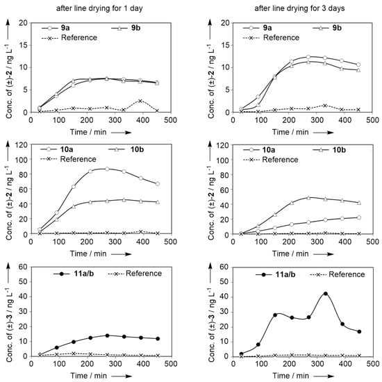 As previously observed for the release of (±)-1 from 4a and 4b, the two diastereoisomers 9a and 9b released comparable quantities of (±)-2 (around 10 ng L−1), independent of their individual stereochemistry. Larger headspace concentrations (with values slightly above 10 ng L−1) were obtained after 3 days than after 1 day (concentrations below 10 ng L−1), indicating that the release of (±)-2 was rather slow. Glycinamide-based profragrance 11a/b released around 10 ng L−1 of (±)-3 and up to about 30 ng L−1 3 days (Figure 7).