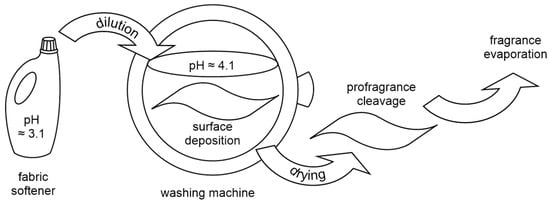 Rinse-added fabric softeners represent a typical application in which profragrances are commonly used to increase the long-lastingness of fragrance perception. A generalised fabric softening process is illustrated in Scheme 2. The perfume and the profragrance are formulated in a concentrated fabric softener emulsion containing a cationic surfactant that is responsible for the softening effect. Typical cationic surfactants used in fabric softeners are quaternised triethanolamine esters of fatty acids (triethanolamine esterquats) [31,32]. The concentrated formulation has a pH of ca. 3.1, at which the profragrance should have maximum stability. After the washing cycle, the softener formulation is diluted, which increases the pH by about one unit to reach a value of ca. 4.1. The perfume and the properfume are then deposited onto the fabric by partitioning between the aqueous surfactant emulsion and the textile surface (indirect deposition) [33,34]. After a few minutes, the non-deposited material is removed with the surfactant emulsion, and the fabric is dried. Profragrance cleavage should occur on the dry fabric to ensure a long-lasting fragrance release. Successful profragrances are thus expected to be stable during storage in the concentrated product formulation, efficiently deposited onto the fabric surface in the softening process and cleaved under environmental conditions on the dry surface to generate the fragrance.