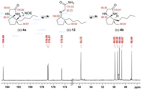 Reaction of l-prolinamide hydrochloride with (±)-1 afforded the crude reaction product in 81% yield. Four possible diastereoisomers of tricyclic tetrahydrospiro[cyclopentane-1,3′-pyrrolo[1,2-c]imidazol]-1′(2′H)-ones 7a–d bearing three five-membered rings can be formed as depicted in Figure 4. Because of the cyclic proline structure, the formation of the intermediate imine structure (equivalent to (±)-12), is not possible. This might explain the higher product yield with respect to the reactions of the other amino acid amides described earlier. Furthermore, the 13C NMR spectrum of the crude product mixture (Figure 4) showed that the different diastereoisomers were not obtained in equimolar amounts, but in a ratio of 7a/7b/7c/7d ≈ 36%:52%:10%:2%, which is presumably due to the formation of a strained tricyclic structure giving rise to energetically more or less favourable isomers.