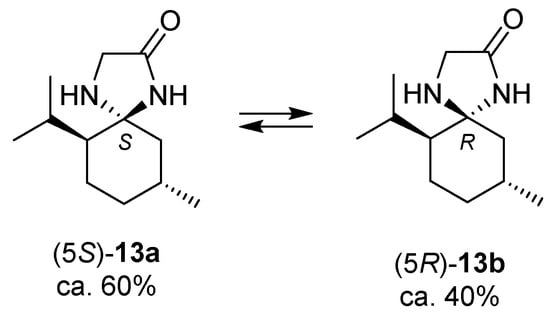 We have previously demonstrated that menthone-releasing imidazolidine-4-ones 13a/b (Scheme 5) isomerised in protic solvents or in the presence of a proton source to reach a thermodynamic equilibrium between the two diastereoisomers [35]. NMR measurements of either (5S)-13a or (5R)-13b in methanol for several days showed that a mixture of the two compounds in a ratio of ca. 3:2 was reached.
