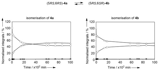 Having isolated the pure diastereoisomers of glycinamide-derived profragrances (5RS,6RS)-4a and (5RS,6SR)-4b, and of l-prolinamide-derived profragrances (1S,2S,7a′S)-7a, (1S,2R,7a′S)-7b and (1R,2R,7a′S)-7c, we wondered whether they also isomerised in a polar environment. We thus performed 1H NMR measurements of the individual diastereoisomers in methanol-d4 over a period of about 50,000 min (ca. 35 d, 4) and 80,000 min (ca. 55 d, 7). Scheme 6 and Scheme 7 show the amount of the different isomers present in the mixture at different time points. Numerical data for Scheme 6 and Scheme 7 and for the following figures are provided in the Supplementary Material. For the measurements, the protons at C(3) of 4a (3.44, 3.40, 3.32, 3.29 ppm) and 4b (3.42, 3.38, 3.37 and 3.34 ppm, although the quartets overlapped, they could be properly integrated), as well as at C(7a′) of 7a (3.71–3.79 ppm), 7b (3.85–3.90 ppm) and 7c (3.80–3.85 ppm), were integrated, together with the corresponding protons of glycinamide (3.81–3.83 ppm), imine (±)-12 (3.84–3.86 ppm) and l-prolinamide (3.65–3.71 ppm). The sum of these integrals was considered as 100% at each time point.