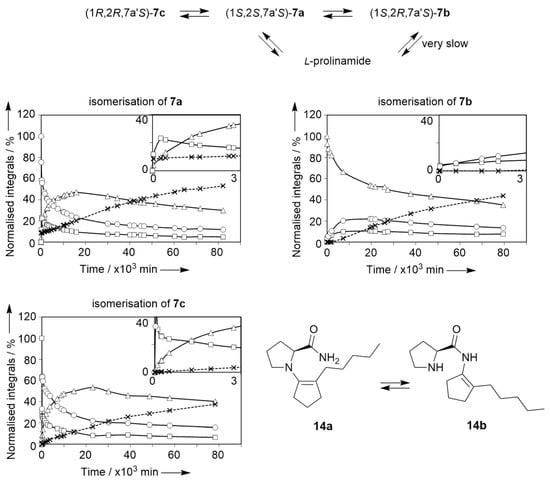 Isomerisation of profragrances 7a (––○––), 7b (––Δ––) and 7c (––□––) via intermediates 14a/b and slow formation of l-prolinamide (---×---) in methanol-d4 as observed by 1H NMR spectroscopy for ca. 80,000 min. The inserts show the evolution of the isomerisation during the first 3000 min.