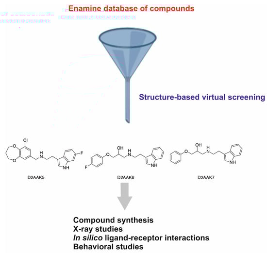 Searching for novel CNS active drugs, we performed structure-based virtual screening [] and identified a number of potential antipsychotics acting through dopamine and serotonin receptors. D2AAK1 [] and its derivatives [,], D2AAK3 [], and D2AAK4 [] display antipsychotic activity in animal models as they decrease amphetamine-induced hyperactivity. Moreover, all these compounds display pro-cognitive properties and some of them have anxiolytic and antidepressant activity. In this structure-based virtual screening experiment we also discovered D2AAK5, D2AAK6 and D2AAK7 (Figure 1), which do not possess a considerable affinity to dopamine receptors but display affinity to serotonin 5-HT1A and 5-HT2A receptors. The common feature of these three compounds is the indole scaffold in their structure which is one of the key privileged scaffolds in drug design and discovery [].