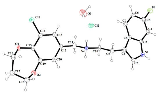 The single crystal of D2AAK5 was obtained by recrystallization polycrystalline compound from a mixture of ethanol–water (1:2). Crystal data, data collection, and structure refinement details are summarized in Table 1. The molecular structure of the compound is shown in Figure 2, and selected bond distances and angles are listed in Table S1 in Supplementary Information. D2AAK5 is the 1:1 molecular salt with the hydrochloric acid proton transferred to the secondary N atom of N-methylethanamine fragment. The compound crystallizes in centrosymmetric triclinic space group with one molecule in the asymmetric unit. The molecular structure of D2AAK5 compound comprises two fused-ring system (6-fluoro-1H-indole and 6-chloro-3,4-dihydro-2H-1,5-benzodioxepine units) linked by N-methylethanaminium fragment. As in the previously reported compounds [,,,], all atoms of the indole group are essentially coplanar (r.m.s. deviation = 0.0115 Å for all non-H atoms), with the largest deviation from the least-squares plane (0.0164(2) Å) being for C8 atom. The dihedral angle between the aromatic and pryrrole ring is 1.5(2)°. The fluorine atom is coplanar with the indole units (r.m.s. = −0.023(3) Å). The 6,7-fused ring system (benzodioxepine) is nonplanar (r.m.s. deviation = 0.2765 Å for all non-H atoms with a maximum deviation of 0.473(2) Å for O(1)). The mean plane of the phenyl ring (C12/C13/C14/C15/C19/C20) is inclined to the plane of dioxepine ring system (C15/O1/C16/C17/C18/O2/C19) by 18.8(2)°. A puckering analysis of the seven-membered ring yielded the parameters q2 = 0.271(3) Å, φ2 = 204.4(6)°, q3 = 0.631(3) Å, and φ3 = 129.5(6)°. These parameters indicate that the dioxepine ring adopts a chair conformation [].