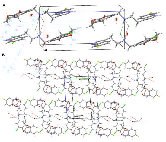 In the extended structure of D2AAK5, the cations and anions are linked by N2–H2N···Cl2 and N2–H3N···Cl2ii (symmetry code: (ii) −x + 1,−y + 2,−z) hydrogen bonds. These interactions give centrosymmetrical dimers, which form rings with graph-set notation of []. These dimers are shown in Figure 3A. Dimers are joined together through O3–H1W···Cl2 and O3–H2W···Cl2i hydrogen bonds into ribbons propagating in the b direction (Figure 3B).