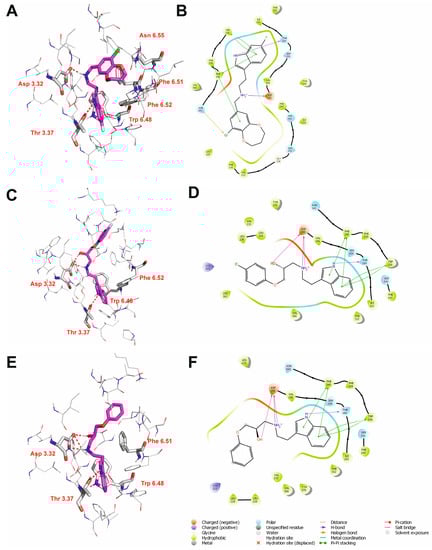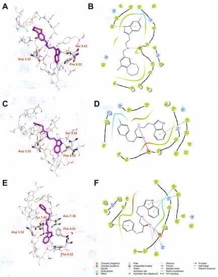 Molecular interactions of D2AAK5 (A,B), D2AAK6 (C,D), and D2AAK7 (E,F) with 5-HT2A receptor based on molecular docking. (A,C,E)—3D details of the binding site. Most important protein residues shown as sticks with grey carbon atoms. Ligands are shown as sticks with magenta carbon atoms. Non-polar hydrogen atoms are omitted for clarity. Polar interactions are shown as red dashed lines. (B,D,F)—2D overview of the binding site.