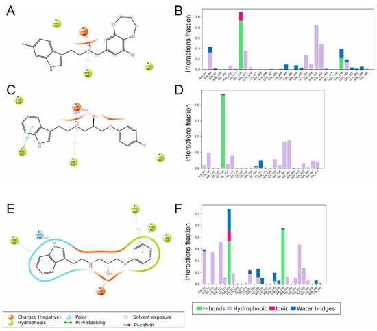 Ligand–receptor contacts (A,C,E) and histograms of ligand–receptor interactions (B,D,F) for serotonin 5-HT1A receptor in complex with D2AAK5 (A,B), D2AAK6 (C,D), and D2AAK7 (E,F) during 1 μs molecular dynamics simulations. The stacked bar charts are normalized over the course of the trajectory: for example, a value of 0.7 suggests that 70% of the simulation time the specific interaction is maintained. Values over 1.0 are possible as some protein residue may make multiple contacts of same subtype with the ligand.