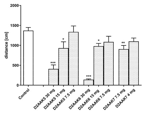 One-way ANOVA showed significant changes in locomotor activity of mice after administration of the compounds D2AAK5, D2AAK6, and D2AAK7 (F(8, 59) = 16.28; p < 0.0001). Dunnett’s post hoc test confirmed a significant decrease in locomotor activity of mice after the administration of compound D2AAK5 and D2AAK6 at the doses of 30 mg/kg (p < 0.001) and 15 mg/kg (p < 0.05) and D2AAK7 at the dose of 7.5 mg/kg (p < 0.01) after 20 min of observation (Figure 8).