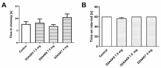 The effects of D2AAK5, D2AAK6, and D2AAK7 compounds were also measured in the rota–rod [] and chimney [] tests. In the first test, the ability of mice to balance on a rotating rod (18 rpm, constantly) was assessed for 1 min. The second test is carried out using a polymer tube (named chimney) with an internal diameter of 3 cm and a length of 25 cm. The chimney is placed in a horizontal position, and the animal is led inside. Once the mouse is at the other end, the tube is placed vertically, forcing the rodent to escape only by climbing backwards on the rough surface inside the tube. Correct motor coordination is considered to be lowering the chimney in no more than 60 s. Prior to the study, animals were trained for 3 days, and only those that were able to stay on the rotating rod or leave the chimney within 60 s were included.