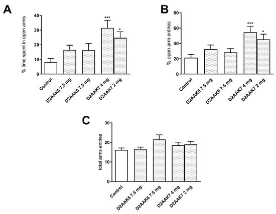 The influence of the investigated compounds D2AAK5, D2AAK6 (7.5 mg/kg), and D2AAK7 (4 and 2 mg/kg) on elevated plus-maze performance in mice–percentage of time spent in open arms (A), the percentage of the open arm entries (B) and total arm entries (C). Investigated compounds were injected i.p. 60 min before the test. The results are expressed as mean ± SEM of the one independent experiment. * p < 0.05; *** p < 0.001; vs. control (Dunnett’s test).