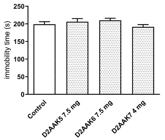 The antidepressant effect of the new substances was assessed in the FST test, which is a simple and fast test established in experimental pharmacology for detecting the antidepressant effect of tested substances []. The animals were placed in the water, and the depressive behavior was observed as immobility and floating of the rodent in the water with only slight movements. In this test, drugs with an antidepressant effect shorten the time of immobility, and those with depressive properties prolong it []. It is designed to reflect human depression. SSRIs are an example of antidepressants active in this test. They block the serotonin transporter (SERT) protein, which transports serotonin, and reduce its reuptake from the synaptic cleft. Due to their effectiveness, they are one of the most commonly used drugs in depression. After administration of D2AAK5, D2AAK6, and D2AAK7, no antidepressant activity was shown in mice because the time of immobility was almost the same as in the control group.