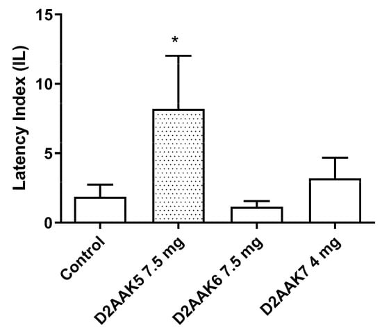 The influence of D2AAK5, D2AAK6 (7.5 mg/kg), and D2AAK7 (4 mg/kg) on memory consolidation was determined during the retention trial of the PA task. Statistical analysis (Student’s t-test) confirmed that the acute administration of D2AAK5 at the dose of 7.5 mg/kg, as well as statistically increasing the latency index (IL) values (p < 0.05) vs. the vehicle-treated group, indicating its pro-cognitive effect (Figure 12).