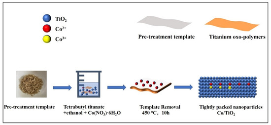 In this study, we adopted a simple one-pot impregnation method (Figure 1), which is more concise than the conventional sol–gel biotemplate method, to replicate the complex structure of hard biotemplates in the microstructure of TiO2. Doped metal ions act as charge complex centers and decrease the lifetime of the electron–hole pairs. Hence, we designed a scheme to reduce the extent of conversion between Co2+ and Co3+ ions by controlling the amount of doped Co ions to determine the ratio of Co2+ ions to Co3+, thus enhancing the photocatalytic efficiency [17].