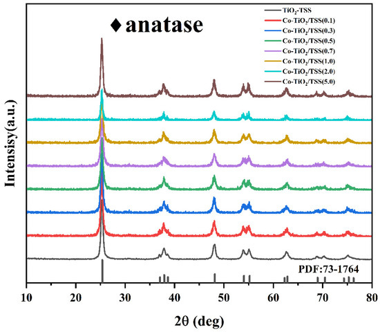 The X-ray diffraction (XRD) patterns (Figure 2) of the prepared materials were acquired to investigate the crystal structure of the biotemplated TiO2. The peaks at 2θ values of 25.34°, 37.01°, 37.85°, 38.64°, 48.14°, 53.97°, 55.18°, 62.24°, and 62.81° correspond to the (101), (103), (004), (112), (200), (105), (211), (213), and (204) crystal planes, respectively, consistent with standard card JCPDS 73-1764. The position of the characteristic diffraction peak of TiO2 did not change, and no dichotomous peak related to Co was observed, which could be attributed to the low Co content [29]. It is worth noting that TiO2 and the TiO2-TSS materials were purely white in color, and the color gradually changed to green with increasing Co doping. Moreover, the crystalline shape of TiO2 did not change after the introduction of the TSS filament template.