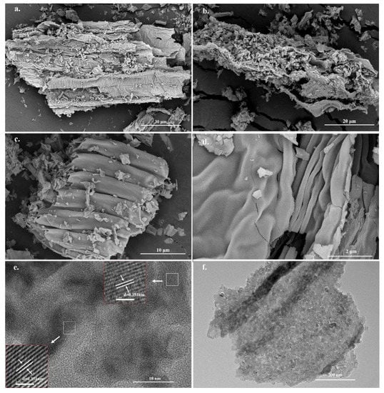 We next studied the morphology of the prepared samples. Figure 3 shows the SEM images of the pure TSS templates. It is evident that the stalk filaments have lamellar structures with folds, and their sizes range from 200 to 300 μm. Figure 4 shows the SEM and transmission electron microscopy (TEM) images of Co-TiO2/TSS(0.5) at different magnifications. Figure 4a–d indicates that Co is fully bound to the active sites on the surface of the TSS during the impregnation process and was successfully replicated after calcination at 450 °C, showing a lamellar folded morphology wherein the shrinkage and collapse of the pore structure resulted in size reduction after calcination at high temperatures [30]. Figure S2 shows the SEM images of Co-TiO2/TSS(5.0). Figure S2a shows that with increasing Co doping, the structure becomes denser and the active sites may not be sufficiently bound, leading to decreased photocatalytic efficiencies. The TEM images also show the microstructure block of the material. Figure 4e shows the lattice stripes and lattice spacing of the Co-TiO2/TSS(0.5). Analysis suggests that all the lattice spacings (d) are 0.351 nm, corresponding to the (101) crystal plane of the anatase crystal. Figure S3a,b shows the TEM image of Co-TiO2/TSS(5.0); only TiO2 lattice stripes are seen despite increased Co doping, indicating that the material has only an anatase crystalline phase. This is consistent with the XRD analysis [31]. The microstructural morphology (Figure 4f) of Co-TiO2/TSS(0.5) shows closely spaced nanoparticles as microstructural building blocks that can exist in a lamellar state.