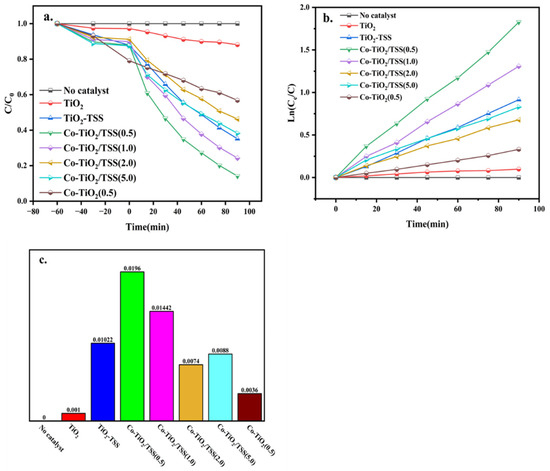 (a) TCH removal kinetics, (b) plot of ln (Ce/C) versus irradiation time, (c) pseudo-first-order rate constants, k (min−1), for photocatalysis with pure TiO2, TiO2-TSS, Co-TiO2, and Co-TiO2/TSS(X).