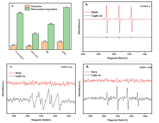 To further understand the active species in the photocatalytic degradation of TCH by Co-TiO2/TSS(0.5), the presence of ·OH, h+, and·O2− was detected by electron paramagnetic resonance (EPR) spectroscopy. TEMPO was used to capture h+ (Figure 6b), and a clear TEMPO signal was detected under dark conditions. When visible light was irradiated for 5 min, the signal from TEMPO significantly weakened, indicating the probable depletion of TEMPO due to h+. In addition, this indicated the generation of cavities under light irradiation. The presence of ·OH, h+, and O2− was verified using DMPO (Figure 6c,d). No signal was detected under dark conditions, and weak signals from DMPO-OH and DMPO-O2− were detected after 5 min of light irradiation. This indicated that the -OH and -O2− active species were produced under light irradiation. Thus, the EPR experiments confirmed that these species played a role in the photocatalytic degradation. The dominant role in the photocatalytic degradation was played by h+ and ·O2−, which is consistent with the results of the active species-capture experiments.
