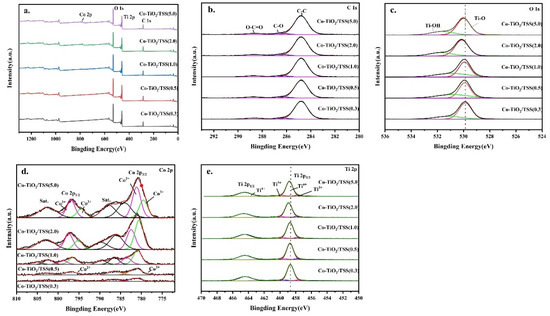 XPS spectra of (a) survey spectra, high-resolution XPS spectra of (b) C 1s, (c) O 1s, (d) Co 2p and (e) Ti 2p for as-prepared samples.