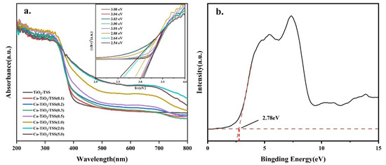 Figure 8 shows the UV–vis diffuse reflectance spectra of TiO2-TSS and Co-TiO2/TSS (X). The Co-TiO2/TSS(X) materials exhibited a higher light absorption ability than TiO2-TSS in the visible region, with redshifted absorption band edges. The enhanced visible-light absorption and narrower band gap energy can be attributed to the sensitization of biomass carbon dopants in the samples induced by the incomplete removal of the biotemplate [21]. The light absorption gradually became more robust with increasing Co doping. Figure 8b shows that the valence band position of Co-TiO2/TSS(0.5) is at 2.78 eV, indicating that Co doping has a negligible effect on the valence band position of TiO2, while the forbidden band width of Co-TiO2/TSS(0.5) was 3.01 eV. Figure 8a clearly shows that Co ions improve the photocatalytic activity by lowering the conduction band position, Ti-O-Co [45] chemical bond formation, which is consistent with the results of the XPS analysis.