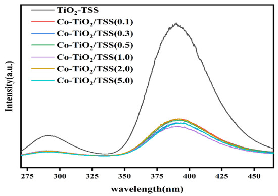 To study the influence of the Ti-O-Co hybrid energy level formed upon photocatalysis and the characteristics of the photogenerated electron–hole pairs, we recorded the PL spectra and transient photocurrent response and performed electrochemical impedance spectroscopy (EIS) characterization of the materials. The separation efficiency of the photogenerated electrons, photogenerated electron–hole complexation, and migration efficiency of the modified TiO2-TSS and Co-TiO2/TSS(X) materials were determined from the PL spectra recorded at an excitation wavelength of 244 nm (Figure 9). As apparent from the figure, the higher the sample PL intensity, the higher the electron complexation efficiency [46]. The spectral intensity of the Co-TiO2/TSS(X) materials is much lower than that of TiO2-TSS, among which Co-TiO2/TSS(1.0) has the lowest spectral intensity. The photogenerated electron and holes were not easily combined, which is in good agreement with the experimentally obtained results of the photocatalytic activity. The presence of Co3+ is not conducive to photocatalysis; thus, the lesser the Co3+ content, the better will be the photocatalysis, because Co, as an electron complex center, will reduce the lifetime of the photogenerated electron–hole pair [47].