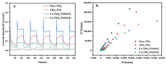 To further investigate the photogeneration of electrons and the transport of the synthesized photocatalysts under visible light, the transient photocurrent response and EIS spectra of TiO2, Co-TiO2/(5.0), TiO2-TSS, and Co-TiO2/TSS(0.5) were recorded. The transient photocurrent responses of pure TiO2, TiO2-TSS, and Co-TiO2/TSS(0.5) under visible-light irradiation are shown in Figure 10a. The transient photocurrent response of TiO2, TiO2-TSS, Co-TiO2/TSS(5.0), and Co-TiO2/TSS(0.5) increased sequentially, indicating an effective separation of the photogenerated electron and hole pairs of Co-TiO2/TSS(0.5).