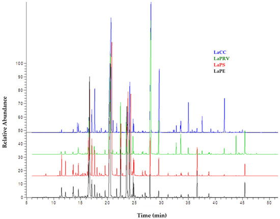 | Terpenes | Abbreviation | LaCC Area % | LaPE Area % | LaPS Area % | LaPRV Area % |