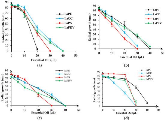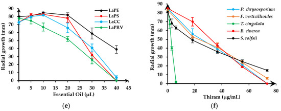 - Diánez, F.; Santos, M.; Parra, C.; Navarro, M.J.; Blanco, R.; Gea, F.J. Screening of Antifungal Activity of 12 Essential Oils against Eight Pathogenic Fungi of Vegetables and Mushroom. Lett. Appl. Microbiol. 2018, 67, 400–410. [Google Scholar] [CrossRef]