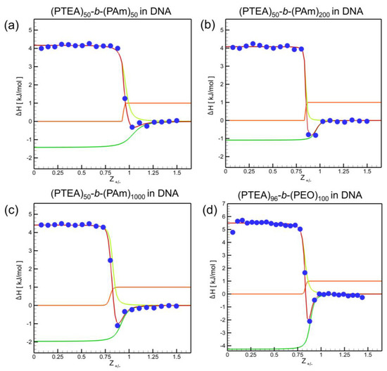 Binding enthalpy for titration (a) PTEA50-b-PAm50, (b) PTEA50-b-PAm200, (c) PTEA50-b-PAm1000, and (d) PTEA96-b-PEO100 with DNA, as a function of their charge ratios (Z+/−).